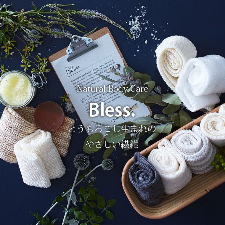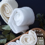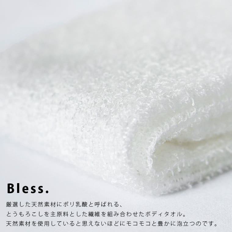 天然素材でここまで泡立つ!やっぱり天然素材が好きだけど、天然素材って、泡立たない感じがする… 天然素材といえば泡立ちにくく使いにくい、といった短所がありました。 そこでBless.シリーズは、ユニチカテラマック・ポリ乳酸というトウモロコシを主原料とした新素材の繊維を混合、天然素材を使用していると思えないほどにモコモコの泡が! Bless.誕生から10年。 感謝の気持ちを込めてリニューアル〜。 編み方や糸を見直して、もっともっと泡立ちやすくなりました! そして、待望のコーン素材100%が新登場ですっ。天然素材×天然素材=人間の肌に近い弱酸性ユニチカテラマック・ポリ乳酸って何…? とうもろこしを主とする再生可能な植物資源を原料に合成された、天然由来のポリマー。 最終的には自然環境下で元の炭酸ガスと水に分解される地球にやさしい素材です。 そんなスゴイ素材ポリ乳酸100%、きめ細かい泡でやさしい「コーン」。 綿と混ざっていないのでその色は光沢感のある白。 コーン繊維は抗菌性に優れた衛生的な素材で、健康な肌と同じ弱酸性です。ブレスは、泡立ちや素材の固さを選べますこちらは、Bless.(ブレス) コーン の販売ページですとうもろこしの繊維が濃密泡〜食べたくなってしましそうな、ふわトロな泡を誕生させるには、水は少な目がよいですよ〜。 ちょっとづつ水分を足す感じで。 せっかくの天然素材なので、石鹸もマルセイユ石鹸などの天然素材が相性抜群◎ お風呂MEDIA (公式サイトへ移動します) ボディタオルの選び方 お風呂でヘアケアは男女&全年代必須!!お風呂と美容の調査報告 ふわふわ&もこもこ!石鹸の泡立て方 バスタイムを美容タイムに!お風呂と美容の深~い関係 お風呂の効果って?基本や目的別の入浴法をご紹介 良い睡眠は良い入浴習慣にあり!眠りとお風呂の関係 商品名ボディタオル「ブレス(Bless.)」コーン商品説明Bless.(ブレス)とは『恵み』という意味。 Bless collectionは、自然の恵みを素肌に感じられる天然由来のバスグッズシリーズです。 ブレスボディタオルは、厳選した天然素材にユニチカテラマック・ポリ乳酸(コーン繊維)を混合することにより、豊かな泡立ちを可能にしました。熟練の国内メーカーが編み上げた、上質な質感をお楽しみください。 ※ポリ乳酸とは、とうもろこしを主とする再生可能な植物資源を原料に合成された、天然由来のポリマー。自然環境下でもとの炭酸ガスと水に分解される、地球に優しい素材です。 【コーン】 コーン繊維は抗菌性に優れた衛生的な素材で、健康な肌と同じ弱酸性です。 きめ細かい泡がたち、やさしい肌触りです。 ※ご利用のモニター環境により色味に差異が生じる場合がございます。サイズ・素材約25×90cm ポリ乳酸100%生産地日本製ご注意肌を傷めないように、こすりすぎにご注意ください。 お肌の弱い方・乳幼児・アレルギー体質の方・及び皮膚に異常のある場合は使用しないでください。 ご使用後はよくすすぎ、水けを切って風通しのよいところで陰干ししてください。JANコード4545229152452