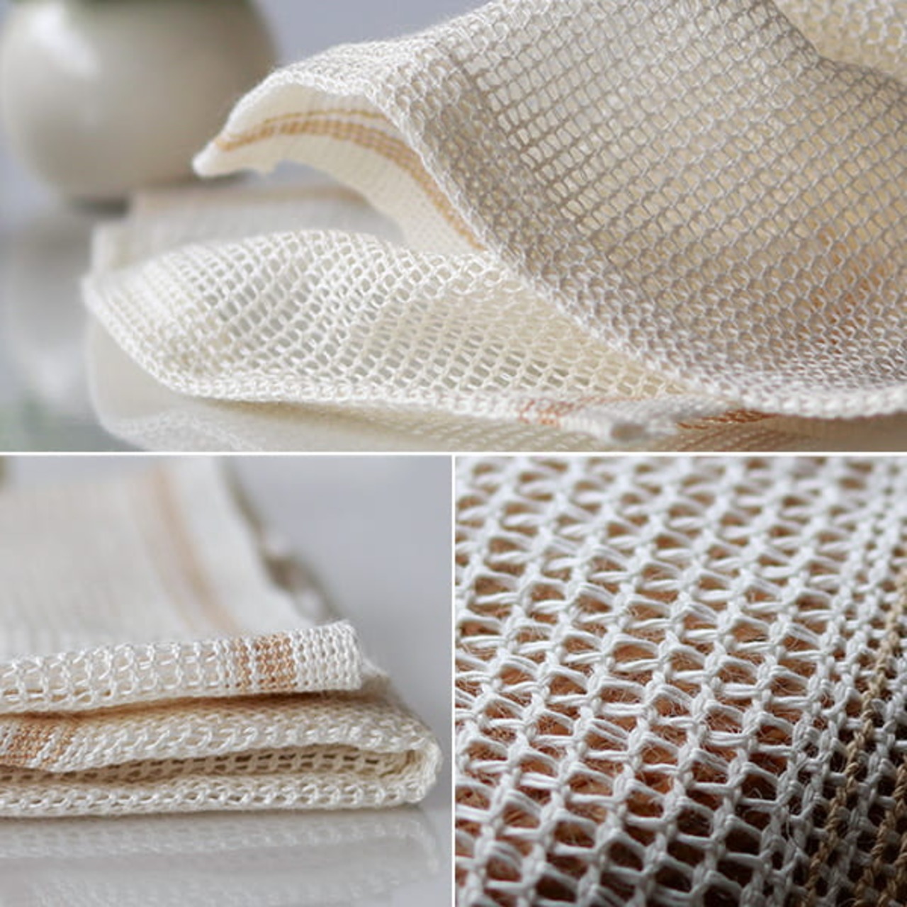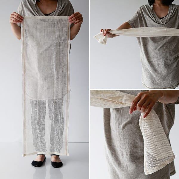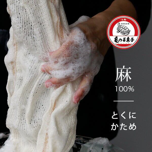 お風呂で体を洗う時、求める肌への刺激具合はひとそれぞれ。 撫でるように洗う人もいれば、ごしごし洗う人もいる。 素手で洗う人もいれば、スポンジやタオル、ブラシで洗う人もいる。 どれが一番いいか、それは好みの問題や肌質によっても違うでしょう。 その中で、ゴシゴシタオルで洗いたい!という方、ナイロンのタオルを使っていませんか? ゴシゴシ派の人は強めの肌ざわりが好きだから、知らず知らずのうちに力を入れて洗ってしまいがち。 でも、肌への強すぎる刺激は決していいことではありません。 ゴシゴシ洗ってキレイ!以前に、肌を痛めてしまうことも…。 なので、安心して心おきなくごしごししたいと思うなら麻のタオルがおすすめです〜。 吸水性のいい麻ボディタオルなら、水分たっぷりのクリーミー泡で全身をゴシゴシ〜。 お肌にやさしい天然素材、なんだか聞き慣れたフレーズですが、やっぱりこれって基本。ゴシゴシするならナイロンより麻ボディタオルを選ぶとき、“ハード”とか“ソフト”とかかたさ具合ばかり気になって、素材を二の次にしてませんか? ハードだろうとソフトだろうとふわふわだろうと…バスリエ的には化繊より天然素材! 確かに化繊のほうが泡立ちはいいかもしれないけれど、肌に直接触れるものだし、ましてや肌をゴシゴシ擦りながら洗うなら…肌にやさしい天然素材! 麻はコットンなどに比べ、丈夫でしっかりかため、天然素材の中では泡立ちもGOOD。 シャリ感のある独特の肌触りでさっぱりと洗いあげてくれます。伝統のからみ織りですっきり亀の子束子の浴用麻ボディタオルは、目くずれしない伝統の「からみ織り」で独特のシャリ感を持たせた麻100%のウォッシュタオル。 麻は、耐久性と吸水性に優れているので、毎日ゴシゴシ洗うボディタオルには適した素材。 また、発散性にも優れているので通気性の良くないバスルームでもしっかり乾きます。 そんな麻を、通気性と肌触りの良さが特徴の“からみ織り”で仕上げた亀の子束子のボディタオル。 ナイロンに比べて泡立ちはどうかな…と思いましたが、けっこう泡立ちます〜! ナイロンタオルのようにもっこもっこに泡立つというよりは、水分をたっぷり含んだクリーミーな泡。 泡がクリーミーだから、ゴシゴシ洗っても肌が守られている感覚で心地よさアップ。 麻の特徴を最大限に生かし、しっかり水を含んで適度な刺激があるので、全身をサッパリ洗いあげてくれる1枚です。ちょっと大きめ、背中もしっかりゴシゴシいける麻ボディタオルのふつうタイプは、ボディタオルとしてはやや大きめ。 一般的なボディタオルより幅広なので、お父さんの背中も余裕でゴシゴシ。 大きくても厚みがあるわけではないので、しっかり握れてしっかり絞れます。SIZE:約34×100cmふつう・かため・とくにかための3種類亀の子束子の麻ボディタオルは、使用している糸の太さから3段階のかたさを選べます。 まるで漁網のようにしっかした「とくにかため」はよりハード志向の方におすすめ。 糸が太く厚みが増したぶん、水と泡をたっぷり含むので肌へのあたりが痛すぎる、ということもなく、しっかりゴシゴシ洗えます。ご覧のページは、麻ボディタオル “とくにかため” の販売ページです↓各商品ページへはこちらからどうぞ↓「とくにかため」のデザインがかわりました以前と使用感に差はございませんので、ご安心ください。 moreゴシゴシさんへ、 たわし健康法はいかがでしょうボディタオルごしごしぐらいじゃ物足りない…そんな方には、お風呂でたわしマッサージなんていかがでしょう。 亀の子たわしで体を洗う=ボディマッサージ 。洗うついでのマッサージだから毎日続けられちゃう、一石二鳥でなんだか得した気分のバスタイム。 お風呂MEDIA (公式サイトへ移動します) ボディタオルの選び方 お風呂でヘアケアは男女&全年代必須!!お風呂と美容の調査報告 ふわふわ&もこもこ!石鹸の泡立て方 バスタイムを美容タイムに!お風呂と美容の深~い関係 お風呂の効果って?基本や目的別の入浴法をご紹介 コンテンツを見る 良い睡眠は良い入浴習慣にあり!眠りとお風呂の関係 コンテンツを見る 商品名亀の子たわしの「麻ボディタオル」とくにかため商品説明目くずれしない「からみ織り」で独特なシャリ感を持たせて洗浄摩擦効果を高めました。 「からみ織り」の特徴は通気性と肌触りの良さ。ほどよい泡立ちと適度な刺激ででさっぱりと洗いあげます。 タオルの長さは余裕の100cm。背中も難なく洗っていただけます。 使用している糸の太さから3段階のかたさを選べる亀の子束子の麻ボディタオル。天然素材にこだわる方におすすめの1枚です。 ※ご利用のモニター環境により色味に差異が生じる場合がございます。特徴特別に織った固めのタイプです。繊維が太く、よりハード志向の方に。種類麻タオル素材麻100%サイズ幅340×長さ1000(mm)生産国日本